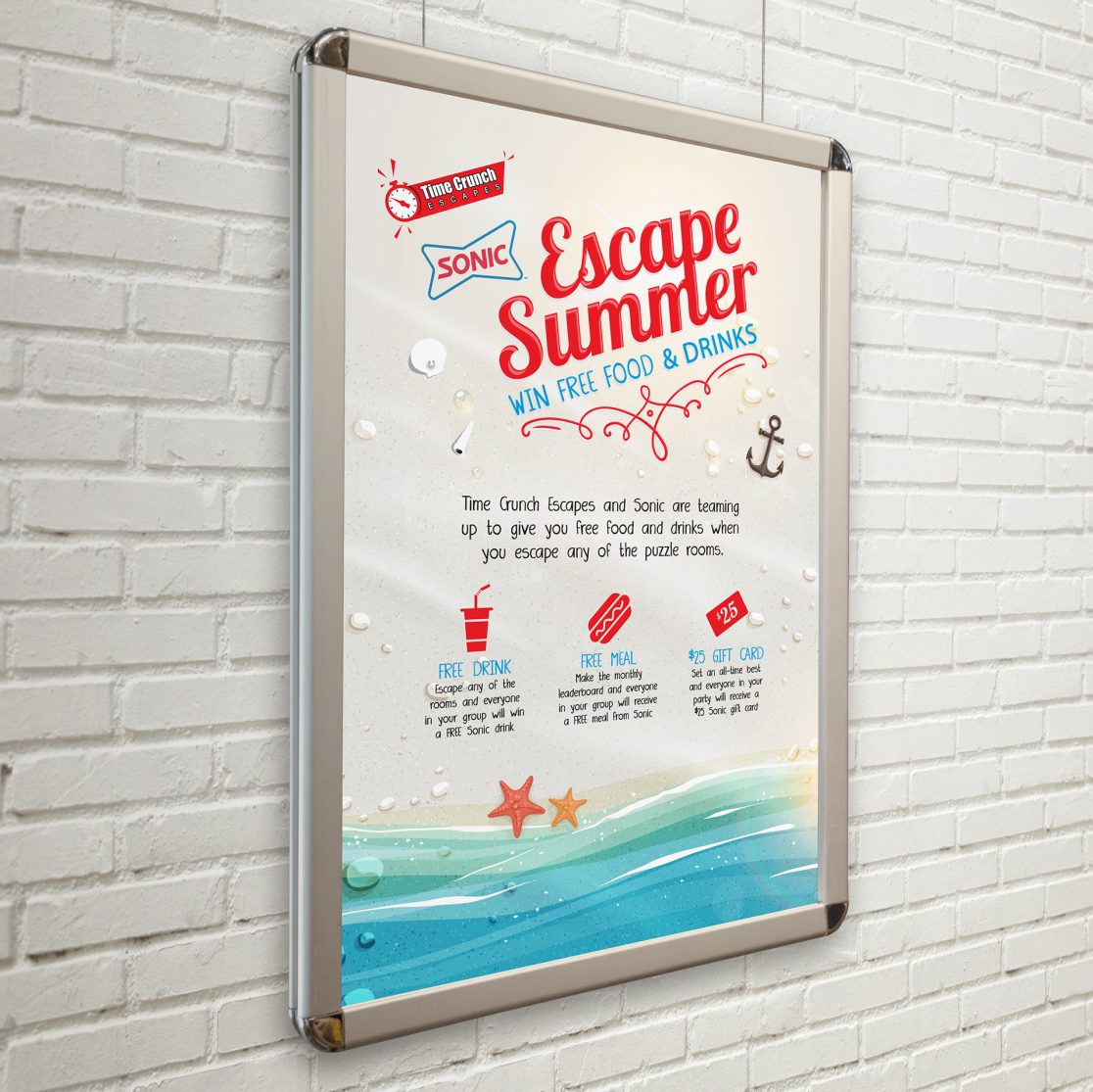 Marketing materials were needed for a cross promotion between Time Crunch and Sonic. A Summer theme was used given the season. Signs were posted in both locations which led to a very successful promotion.